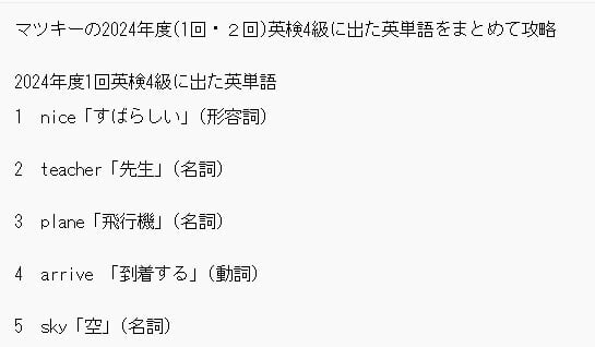 2024年度1回・2回の英検4級に出た英単語を覚えられるようにしました。 英語のプロが厳選した80語で以下のようになっています。 英単語→日本語→品詞