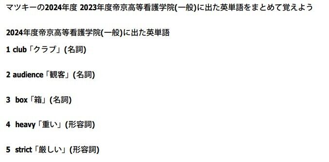 2024年度 2023年度看護専門学校に出た英単語シリーズの帝京高等看護学院(一般)版。